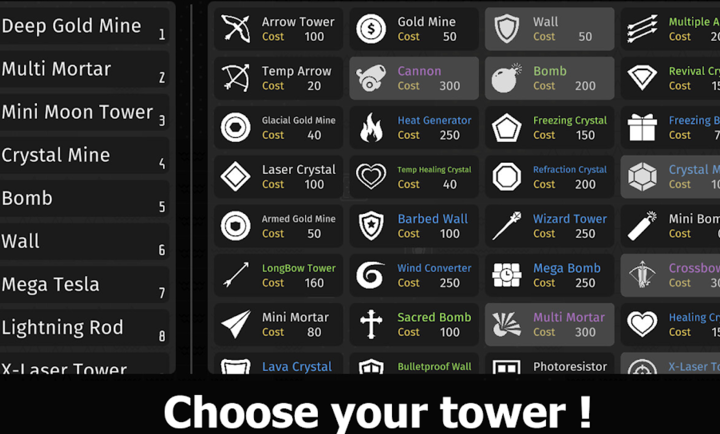 3、深度防御塔系统,提供44种防御塔(含箭塔、加农炮、晶塔等),每种塔有独特属性(攻击范围、特殊效果)和升级路径。