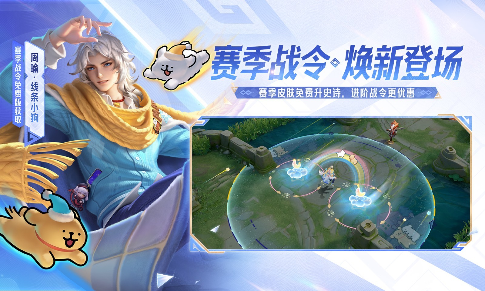 1、线条小狗联动开启,周瑜小乔战令皮肤上线,联动小兵上线