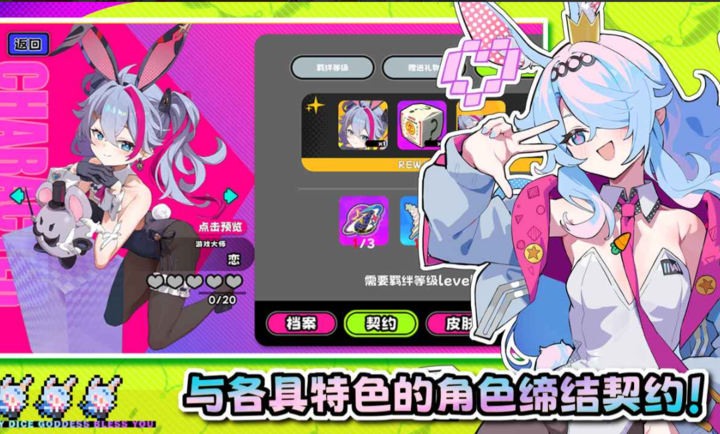 1、二次元角色与技能系统,提供米米、帕露南、芬妮等数十名二次元角色,每个角色拥有专属主动技能和被动技能。