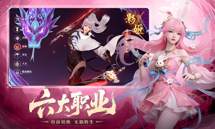 2、六大职业自由切换,突破传统MMO职业限制,提供疾羽、破军、剑仙、梨落、大圣、影姬六大职业。