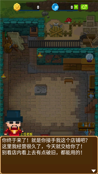 1、下载进入锻冶屋英雄谭2游戏,通过和上任老板对话,了解这个店铺;