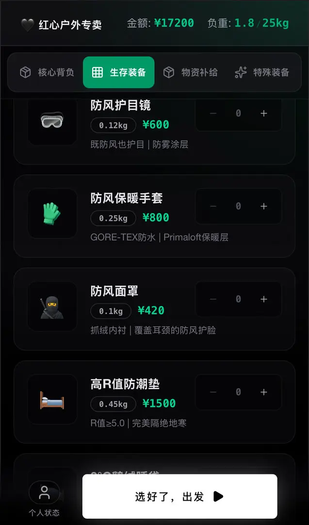 赛博徒步之生死鳌太线是一款文字模拟游戏,在赛博徒步之生死鳌太线中,玩家将扮演一名徒步者,在失温、缺氧、物资匮乏、野生动物威胁等多重危机中,通过资源管理、装备选择、路线规划与道德抉择,挑战这条死亡率超33%的“死亡之线”。