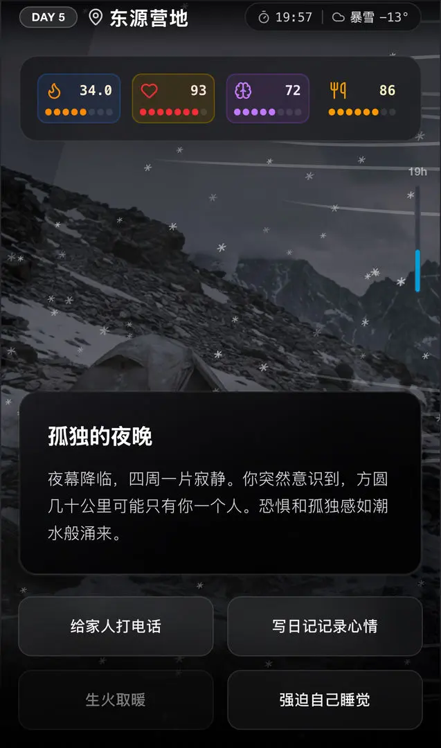 体温、体力、含氧量、饥饿值等指标实时变化。过度疲劳会触发眩晕,失温导致行动迟缓,缺氧引发幻觉,甚至因低血糖陷入昏迷。