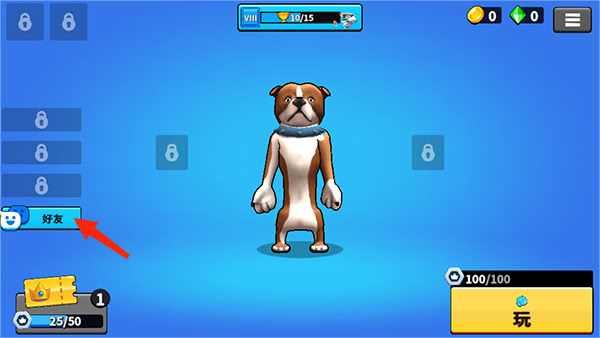1、进入游戏主界面后,注意部分功能图标处于锁定状态,需完成若干局游戏后方可解锁;点击“好友”选项进入社交页面;